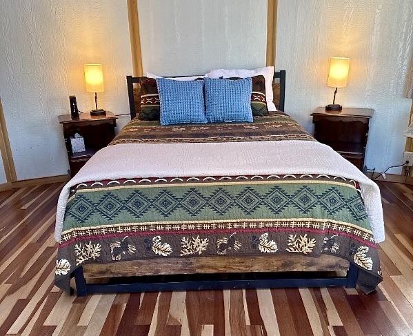* Sleeping: A plush Queen-sized bed awaits, positioned to maximize the cozy, circular vibe of the yurt.